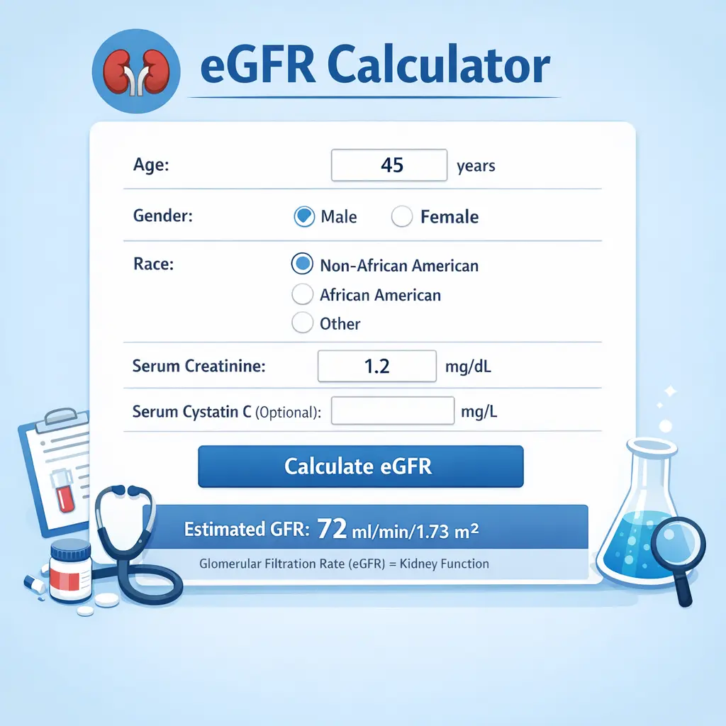 Glomerular Filtration Rate (GFR) is the best overall index of kidney function. This calculator implements the CKD-EPI 2021 equation, validated in multinational cohorts and recommended by the Kidney Disease: Improving Global Outcomes (KDIGO) 2024 guidelines.
